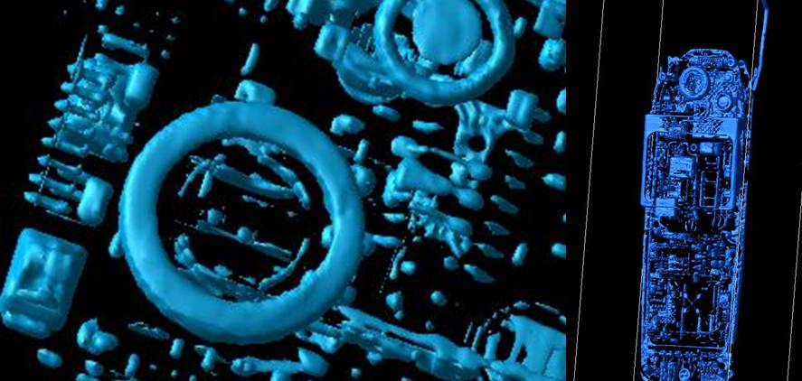 Presented a range of 2D and 3D views that could be manipulated to see features. An ancient mobile phone, the Nokia 702 amongst other items were investigated. About 1500 2kx2k X-ray images were captured over evenly spaced rotation angles of the mobile phone. These were reconstructed to create a 3D volume approx 1500 x 1000 x 1000.